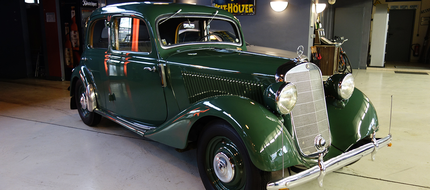 Wenige Tage vor Ausbruch des Zweiten Weltkriegs – genauer: am 16.08.1939 wurde die grasgrüne Mercedes Limousine in Malmö, Schweden ausgeliefert. Welch glücklicher Umstand, dass der 170 V gleich nach der Produktion ins Ausland gelangte – auf deutschen Straßen hätte der Mercedes wohl nicht lange überlebt, denn zu dieser Zeit zog die Wehrmacht so gut wie alle Autos ein. Jedoch nicht in Schweden: Dort rollte der Mercedes Benz 170 V zwei Wochen später samt glücklichem Besitzer über die schwedischen Straßen. Diesem Umstand ist es wohl auch zu verdanken, dass die Limousine nicht nur noch existiert, sondern die über 70 Jahre in außergewöhnlich guten Zustand überdauert hat.